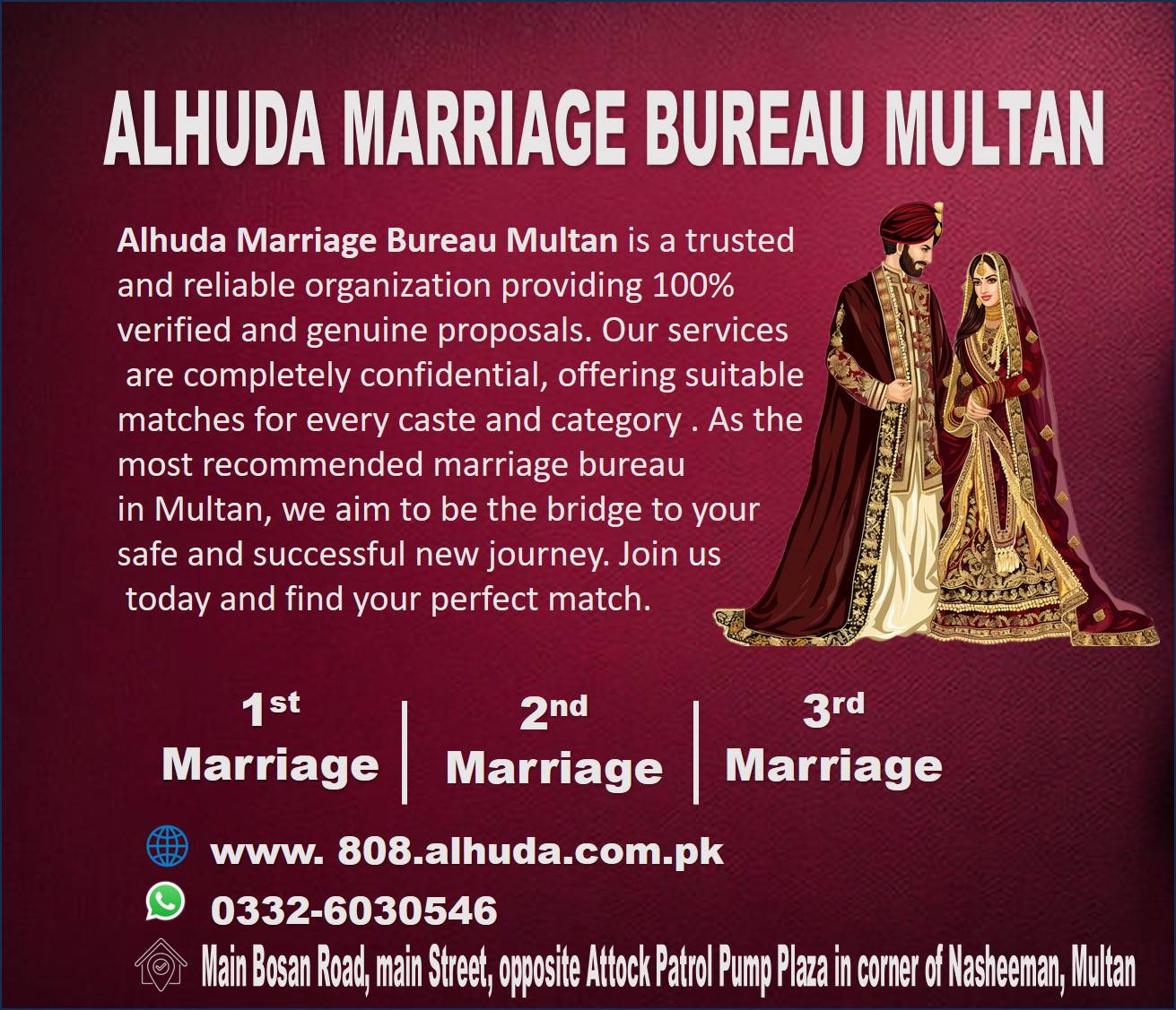 At Alhuda Marriage Bureau Muzaffargarh, we are dedicated to guiding you on your matrimonial journey, helping you find a lifelong companion who shares your values and aspirations. Our personalized matchmaking services, coupled with our cultural sensitivity and adherence to Islamic principles, make us a trusted partner in your search for a blessed union.